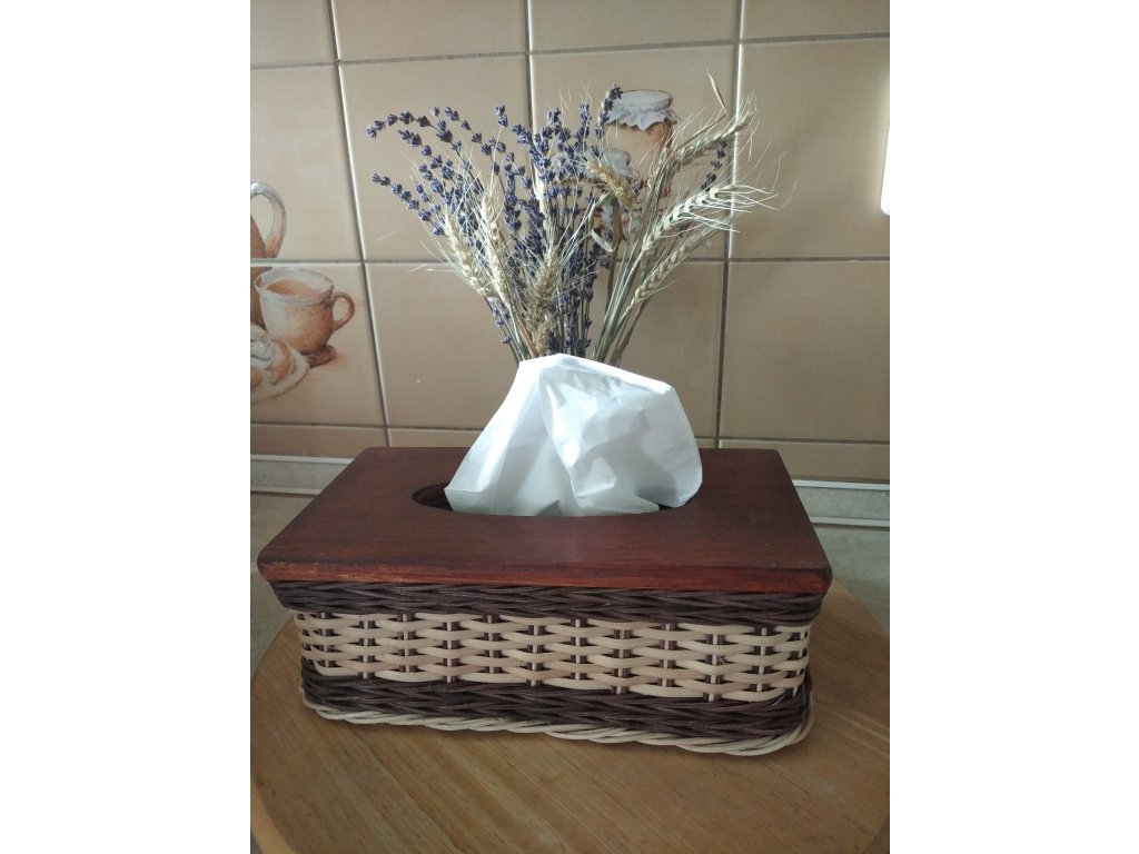 Tento kapesníčkovník spojuje jedinečnou eleganci s přírodním šarmem. Jeho víko je vyrobeno z borovicového dřeva o tloušťce 8 mm, které je natřeno hnědou akrylovou barvou.