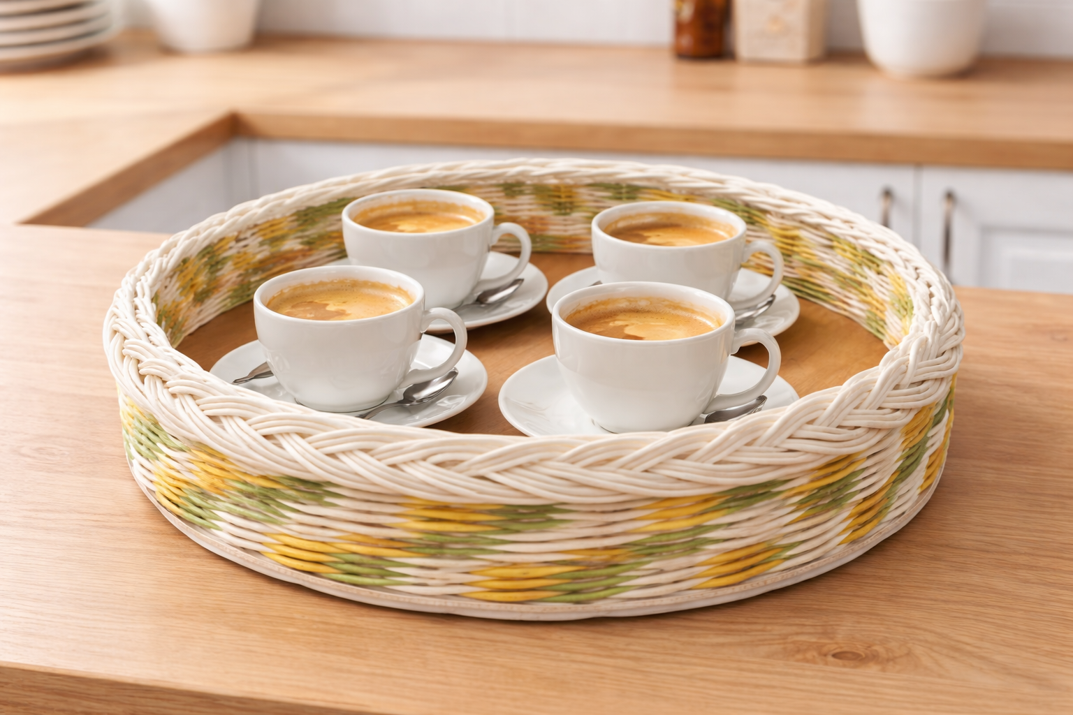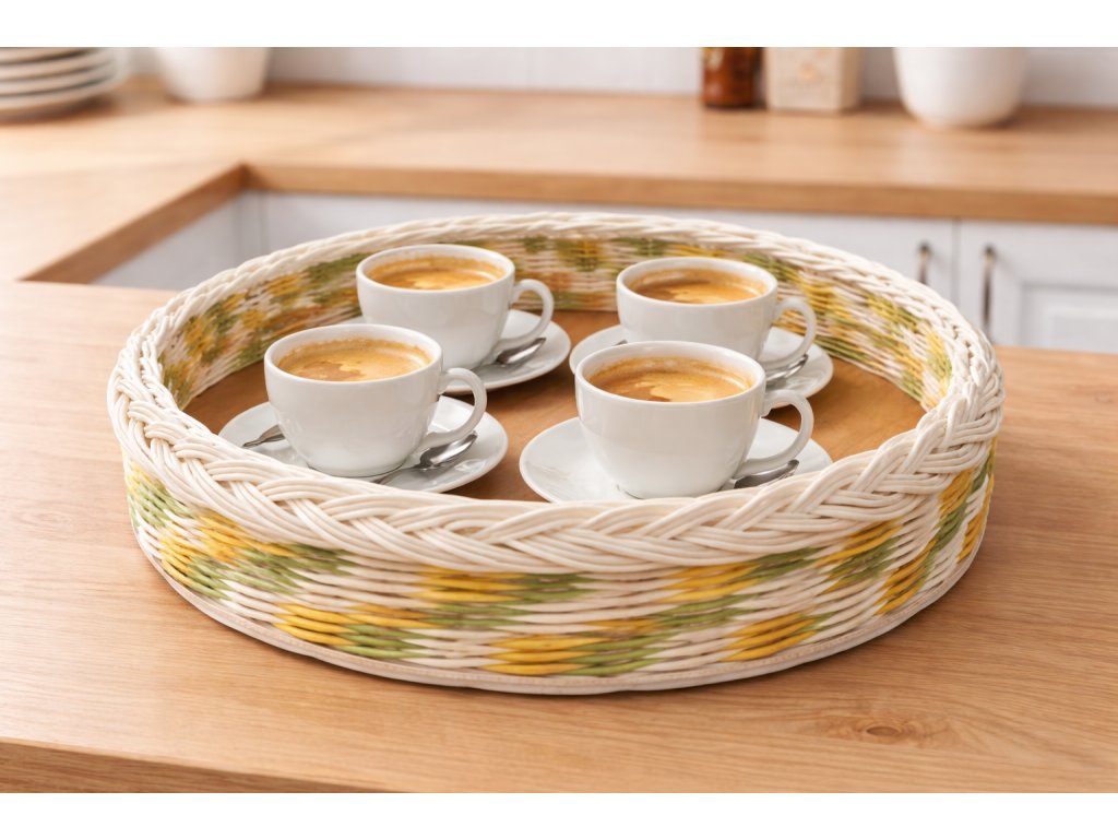 Ručně pletený podnos z přírodního pedigu, který na stole nepřehlédnete. Bohatý copánkový lem dodává podnosu pevnost i charakter. Je to detail, který dělá rozdíl.